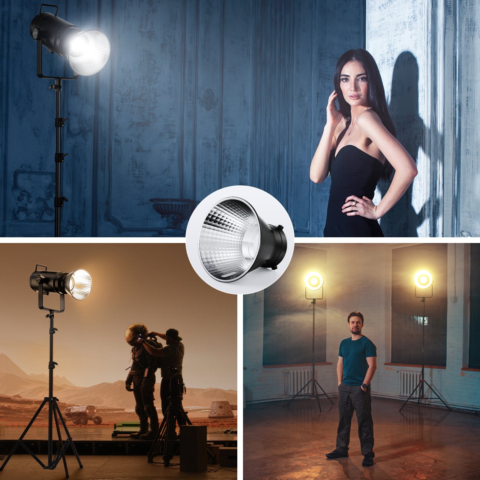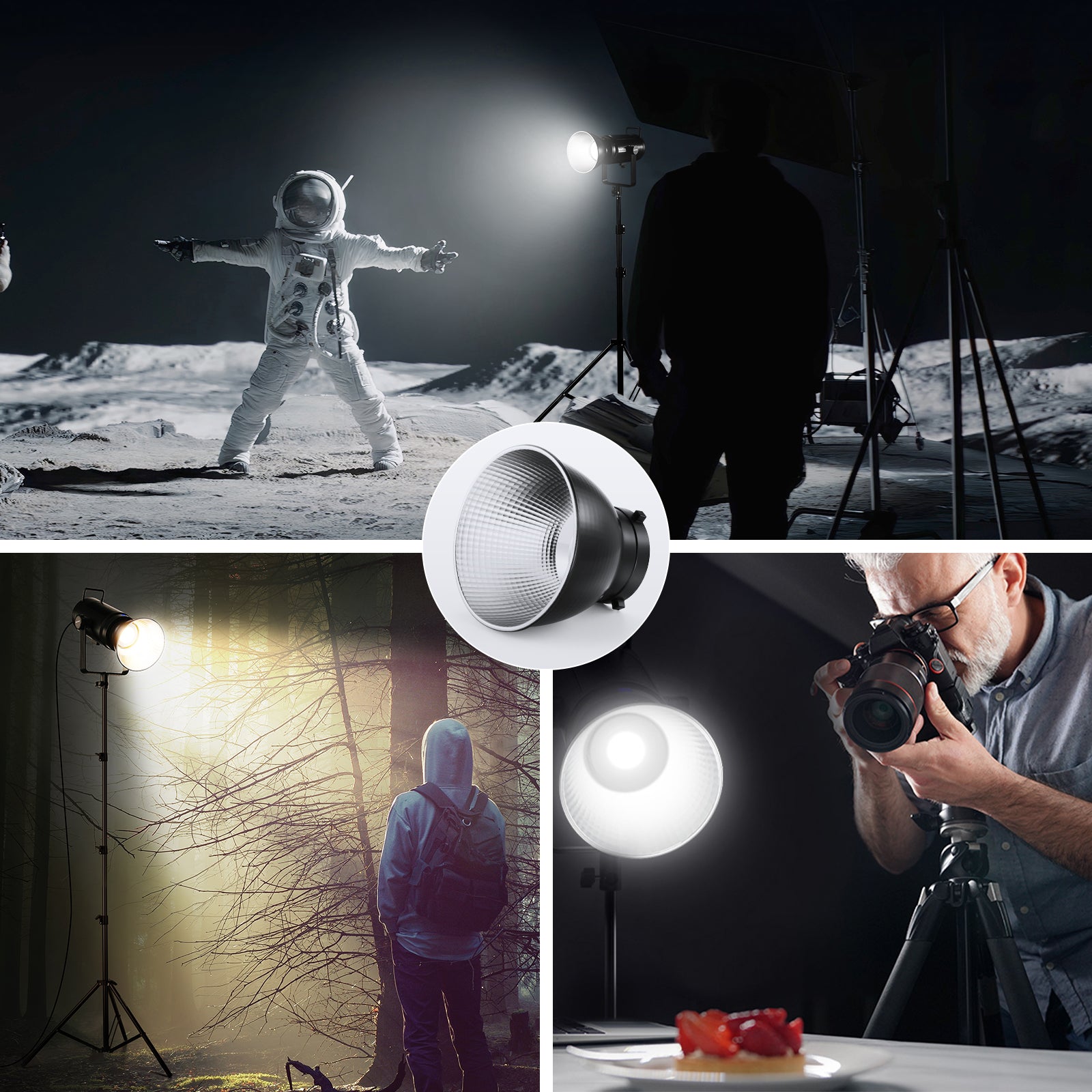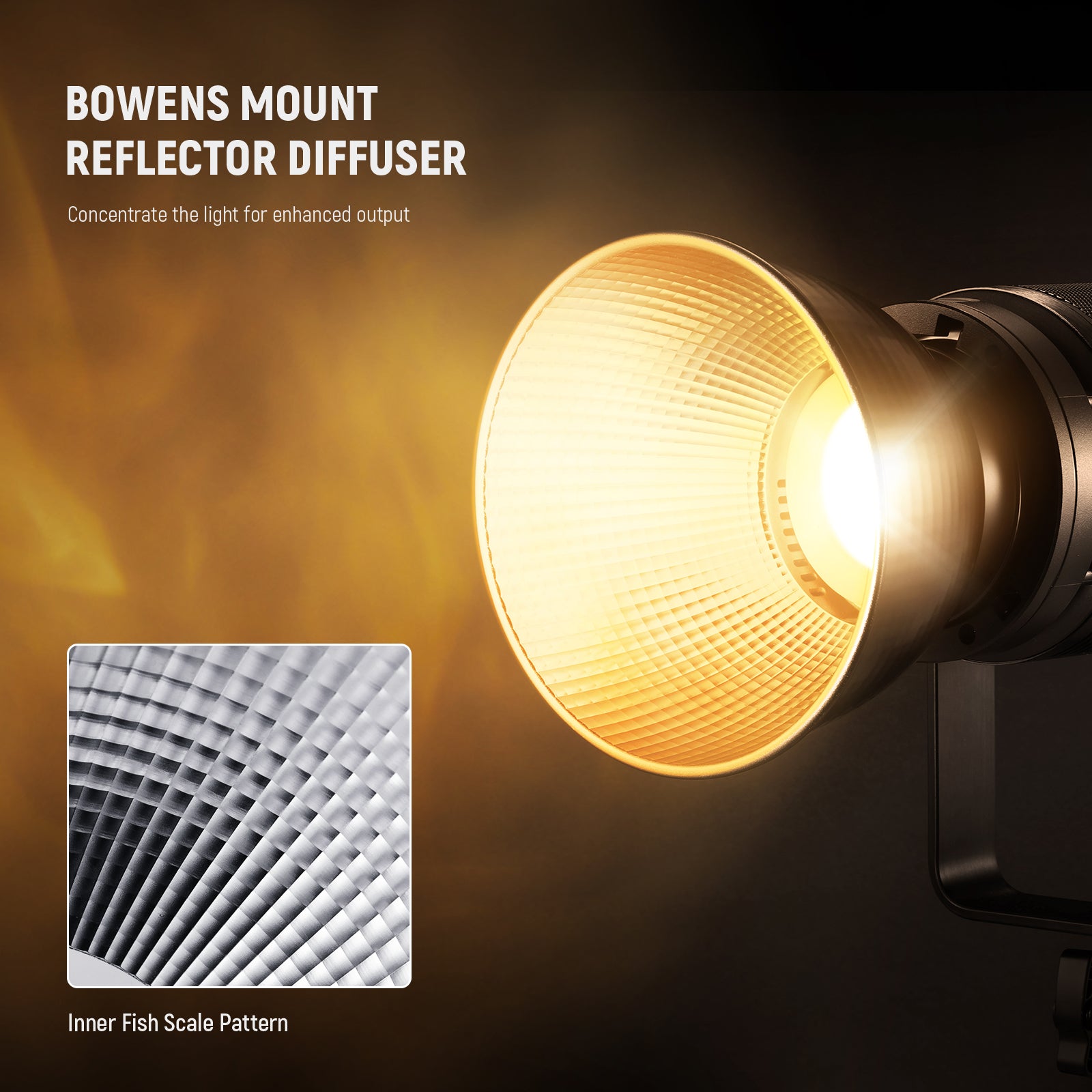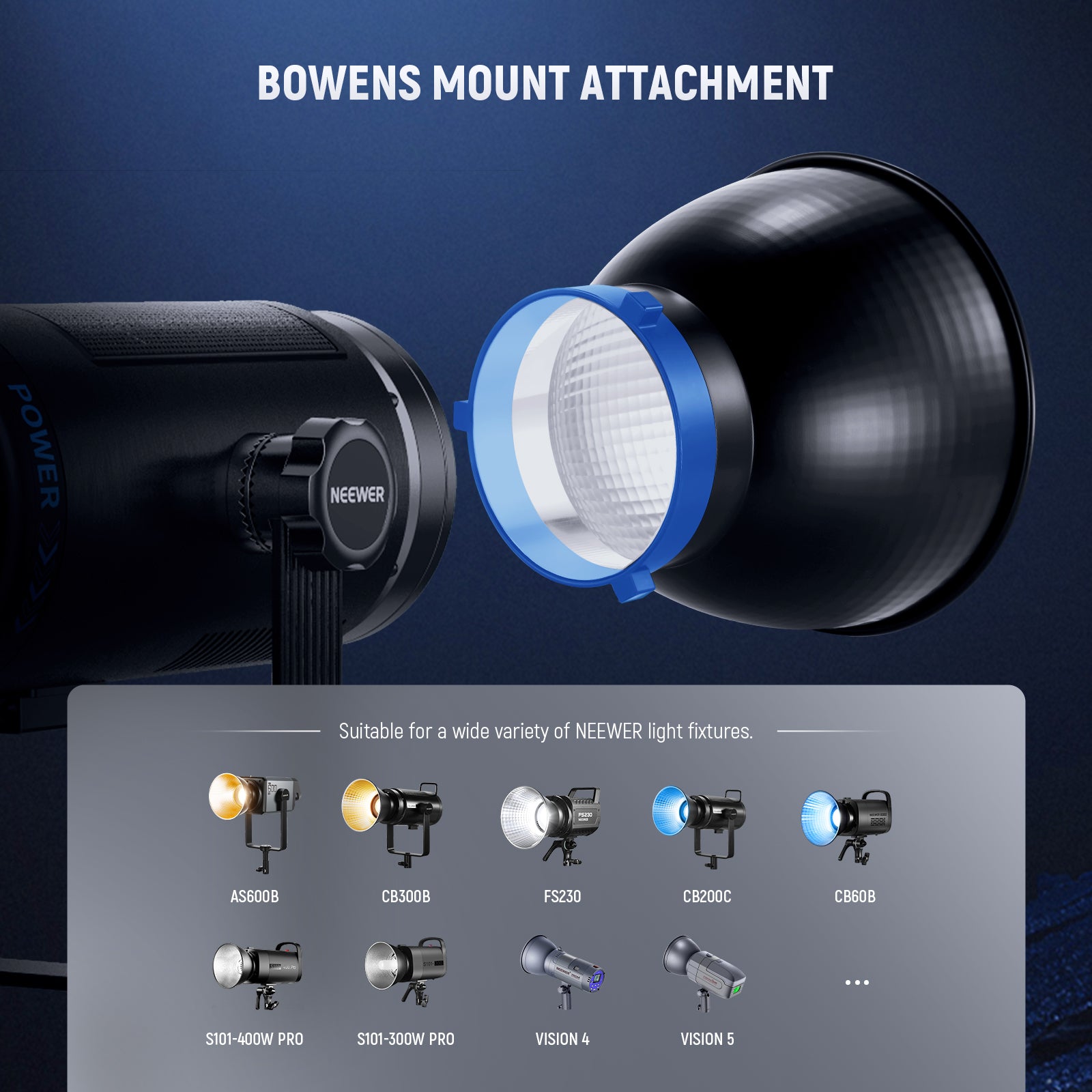 - Universal Bowens Mount- Suitable for NEEWER CB60/CB60B/CB60RGB/CB100/CB100B/CB150/CB200B/CB300B/ FS150/FS150B/FS230/FS230B LED video lights and Q4/Vision 4/Vision 5/S101-400 Pro/S101-300W Pro studio monolight flashes. Also compatible with Godox and compatible with Aputure