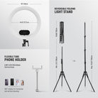 - Convenient Touch Control & Bluetooth Remote- Featuring a touchscreen interface, the big standing halo ring light allows you to easily adjust lighting settings with a simple tap, bringing a user friendly and efficient control experience. The high resolution display intuitively shows real time status and parameter information, keeping users informed at all times. A Bluetooth remote is included, easily controlling the light during shooting without reaching the panel or your phone screen