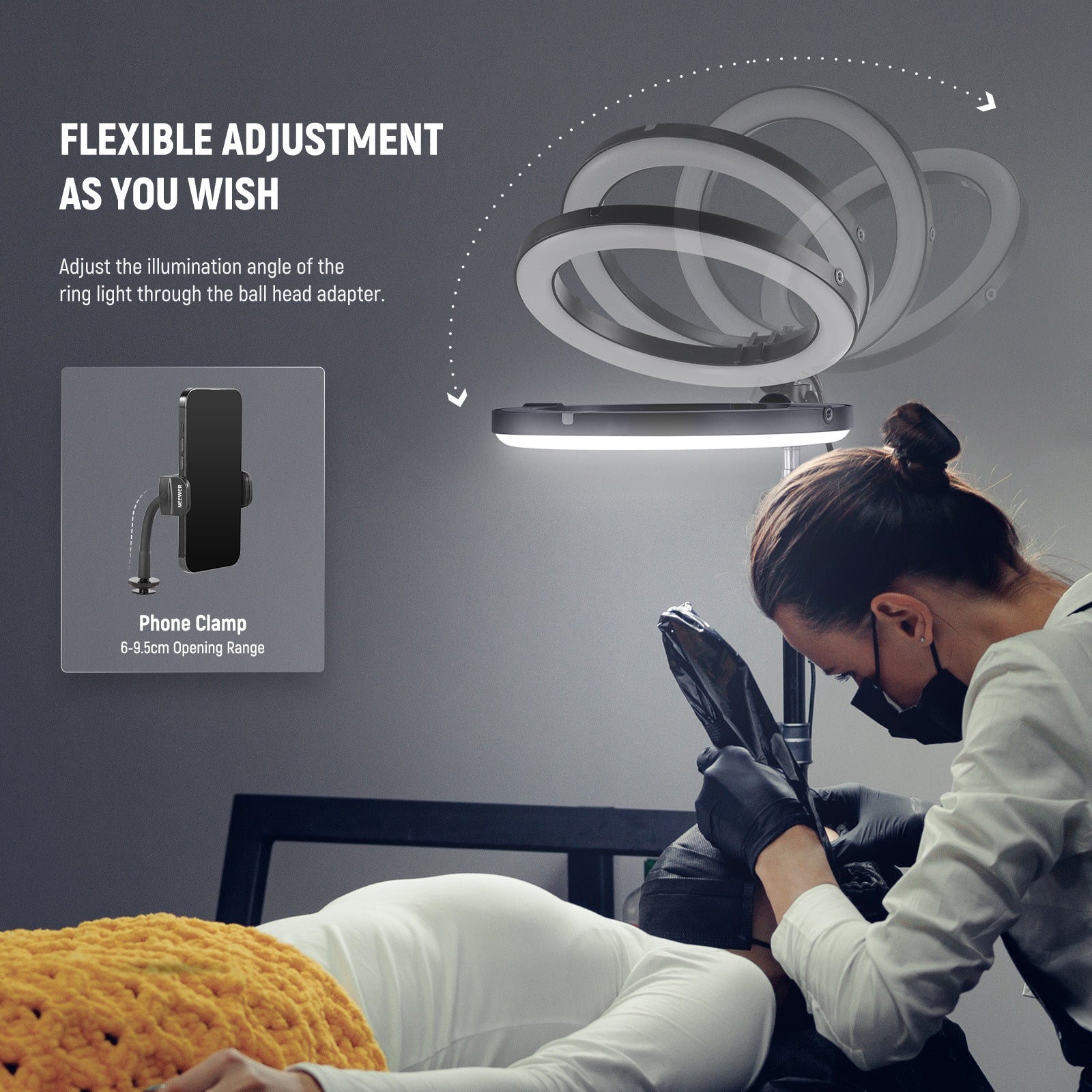 - 360° Ball Head & Cold Shoe Mount- The kit includes a 360° ball head with a 1/4" screw for easy attachment of the ring light to the light stand, allowing for 360° rotation and a 90° tilt to provide flexible angle adjustments. Meanwhile, the cold shoe mount secures the flexible phone holder, keeping your smartphone in place for versatile mobile photography