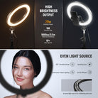 - 20W Powerful Bi Color Ring Light- A 20W powerful circle ring light as key or fill light for makeup, artist esthetician lash eyelash extension, tattoo, video recording lighting, streamer live streaming, computer Zoom calls, photoshoot, selfies, and to film TikTok social media vlog. 168 LEDs (84 cool white & 84 warm white), 0-100% dimming, 1660LX/0.5m illuminance, and CRI 97+/TLCI 98+ produces a bright, or soft, diffused, and even light source with impeccable color accuracy