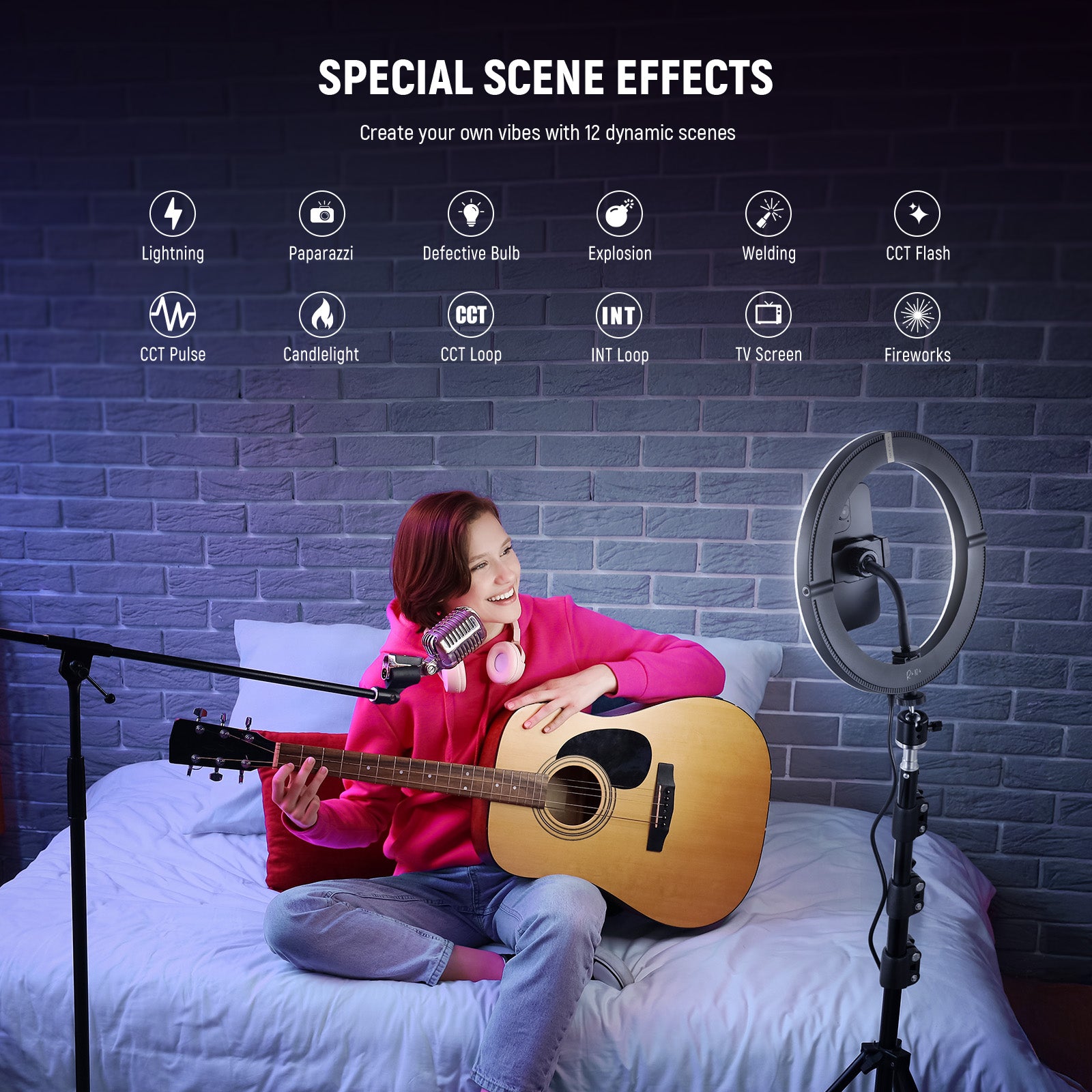- CCT & FX Scene Effect Modes- CCT Mode offers 2900K-7000K warm and cool lighting along with 0-100% dimming. The flexibly adjustable lighting can flatter all skin tones, brighten your face, and minimize blemishes. FX Mode brings 12 realistic scene effects for professional video shooting. Use the wired controller to quickly get the effect you want