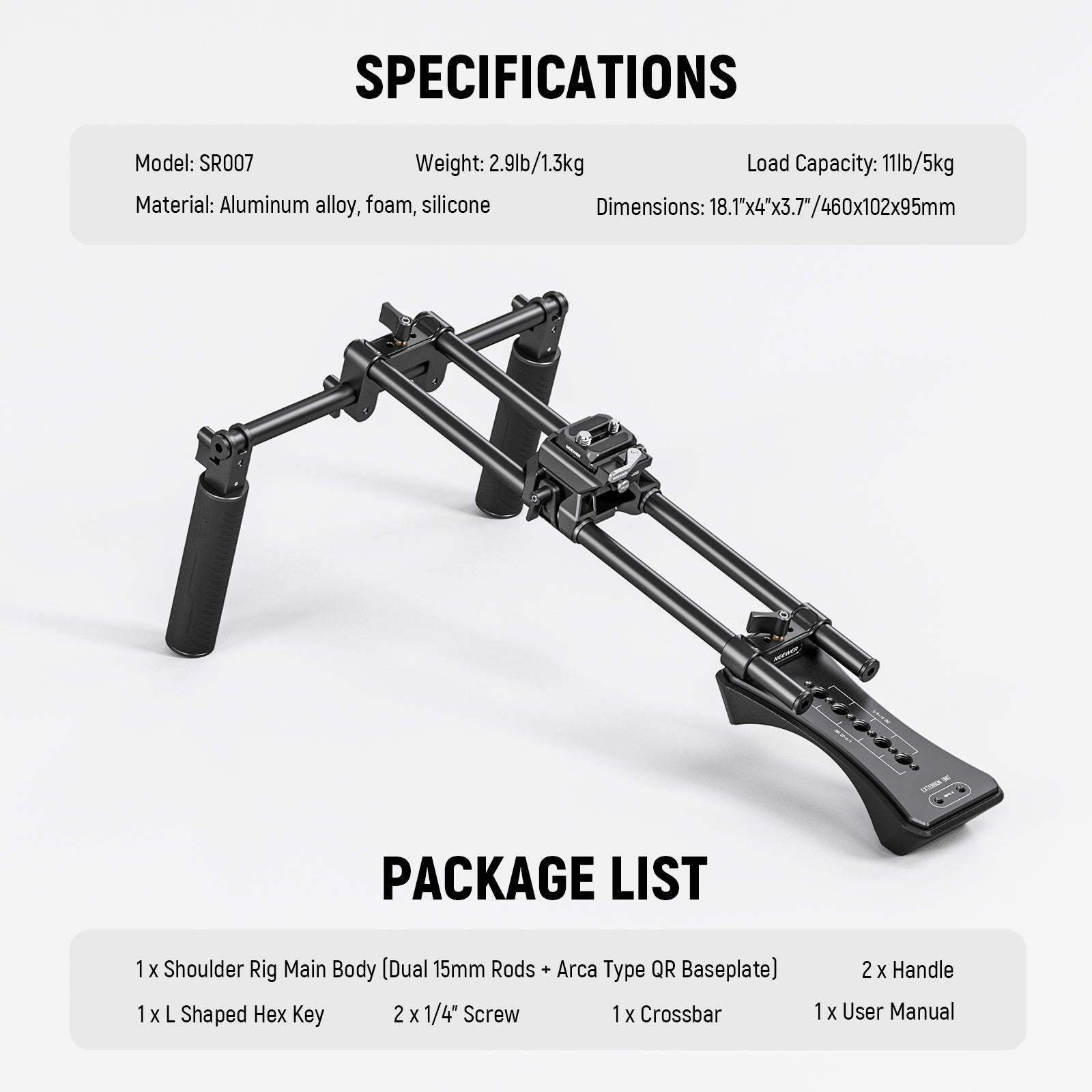 - 1 x Shoulder Rig Main Body (Dual 15mm Rods + Arca Type QR Baseplate)