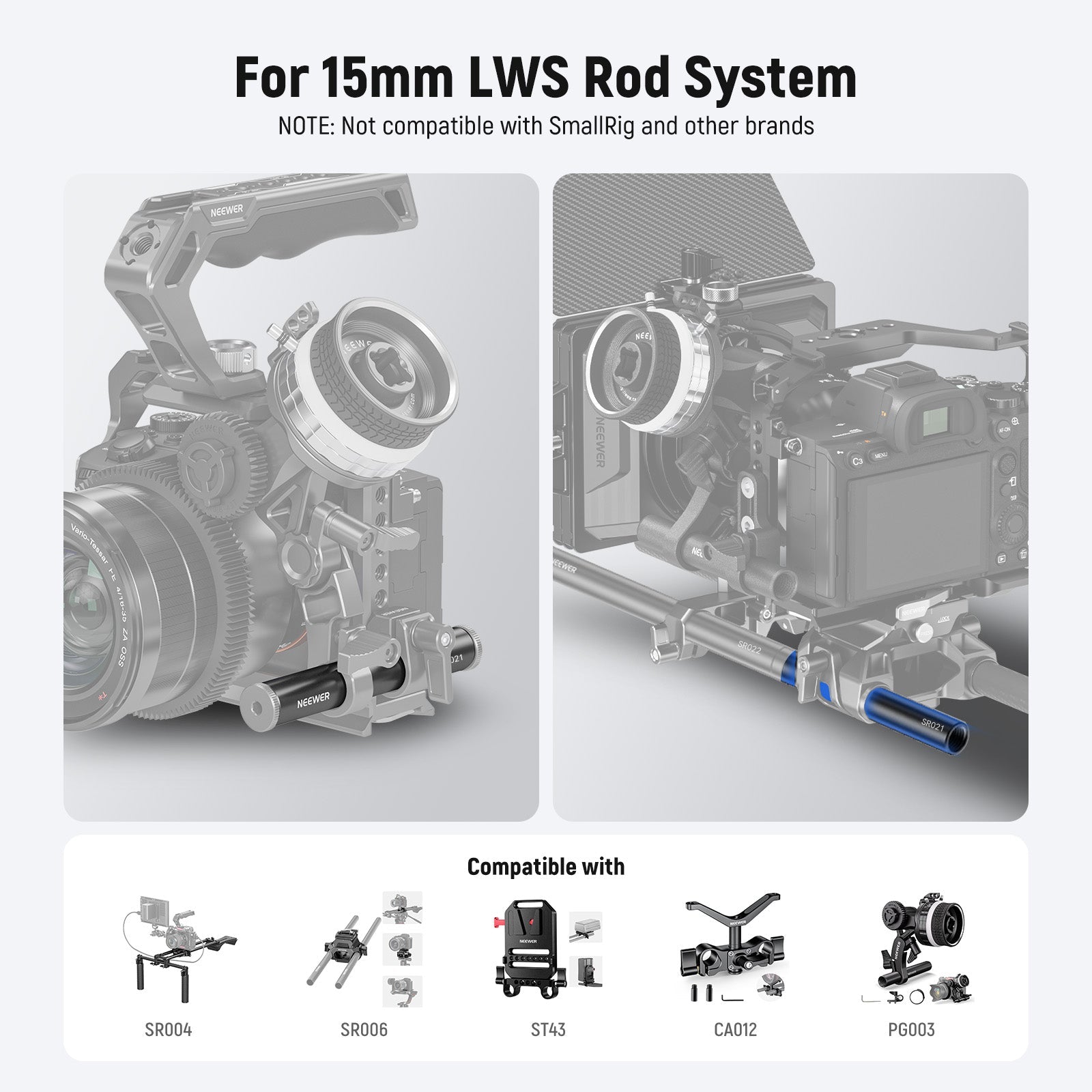 - For 15mm LWS Rod System- Compatible with NEEWER SR004 Shoulder Rig, SR006 Baseplate, PG002 Matte Box, PG001/PG003 Follow Focus, ST-43/PS007/VB-A1 V Mount Battery Plate, CA012 Lens Support, and other 15mm rod LWS equipment