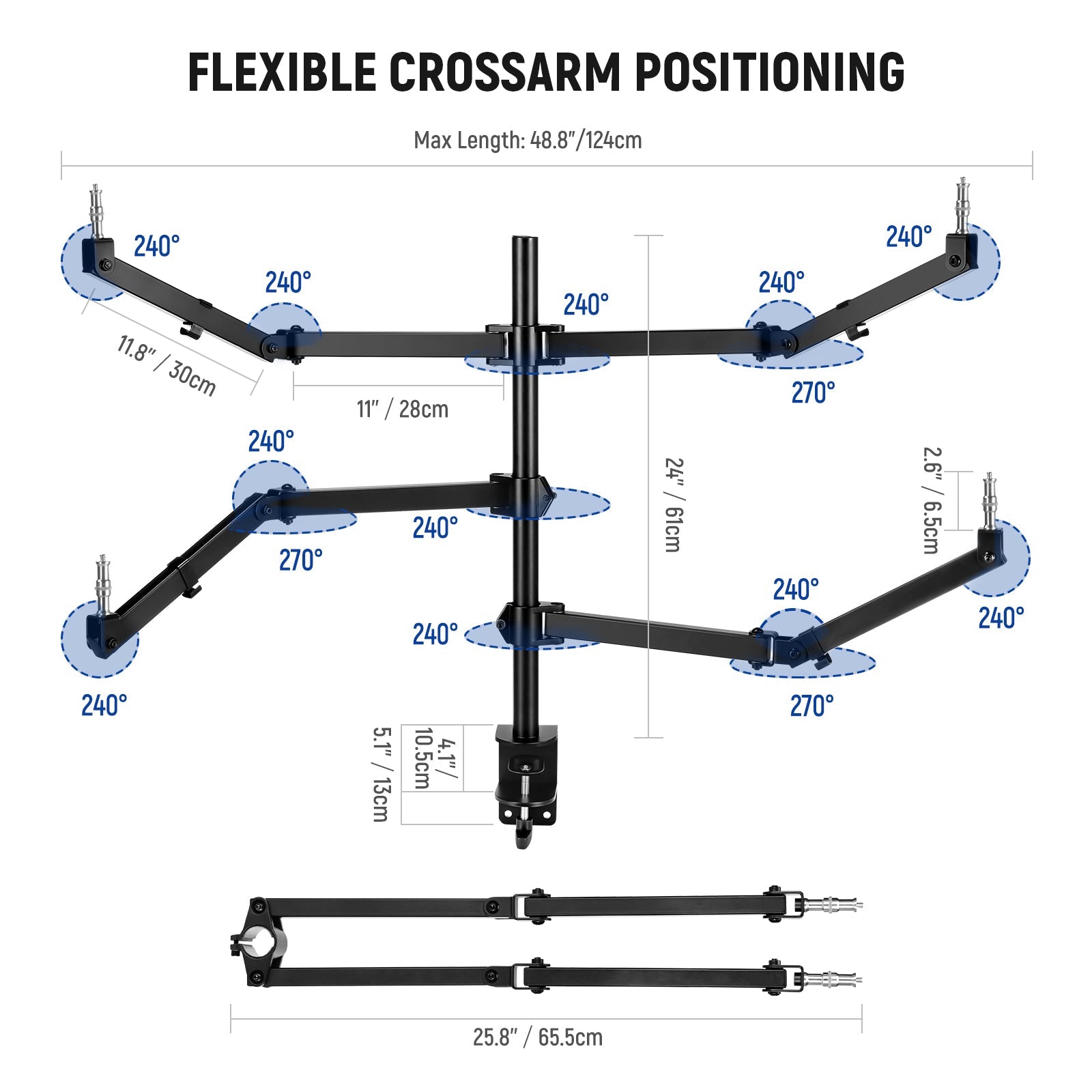 - Flexible & Detachable Boom Arms- The camera arms/mic arms give you the freedom to customize your setup and achieve the best recording or streaming experience. The joint between the center column and the arm is 240° rotatable. The arm itself can swing 270° and tilt 240°, and the ended screws can also tilt 240°. All the arms are detachable for you to adapt the setup to your specific needs