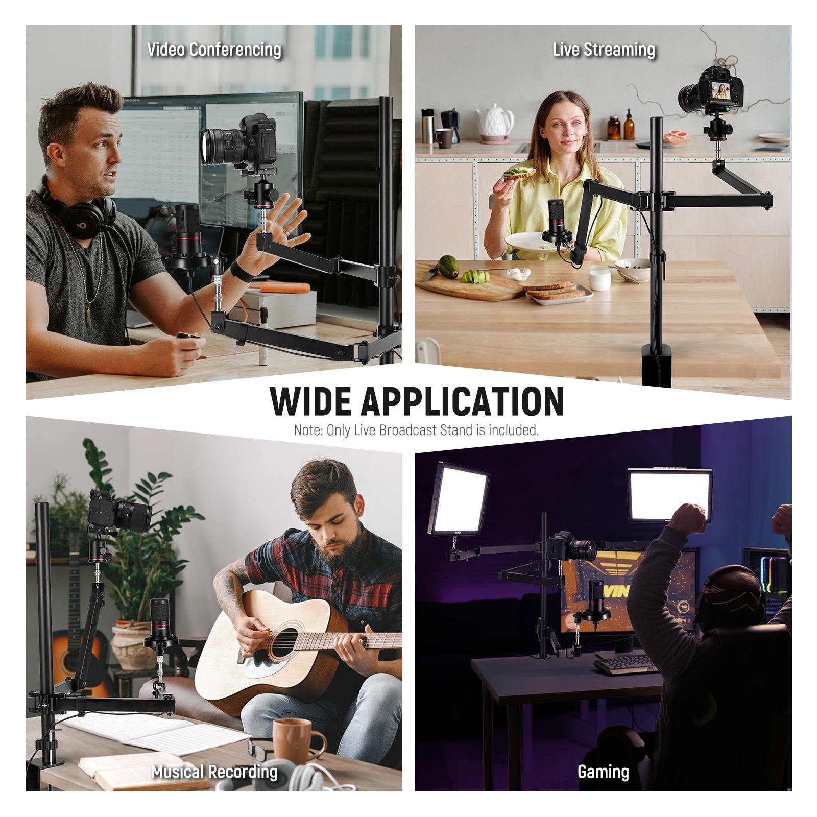 - Tree Like Camera Arm Desk Mount- NEEWER ST004 is a versatile mounting solution designed to hold webcams, microphones, ring lights, LED lights, and other accessories for video recording, live streaming, podcasting, Zoom calls and gaming. It consists of a center column with a desk clamp, a dual side cross arm, and two single side cross arms, allowing you to position your devices at various angles and heights