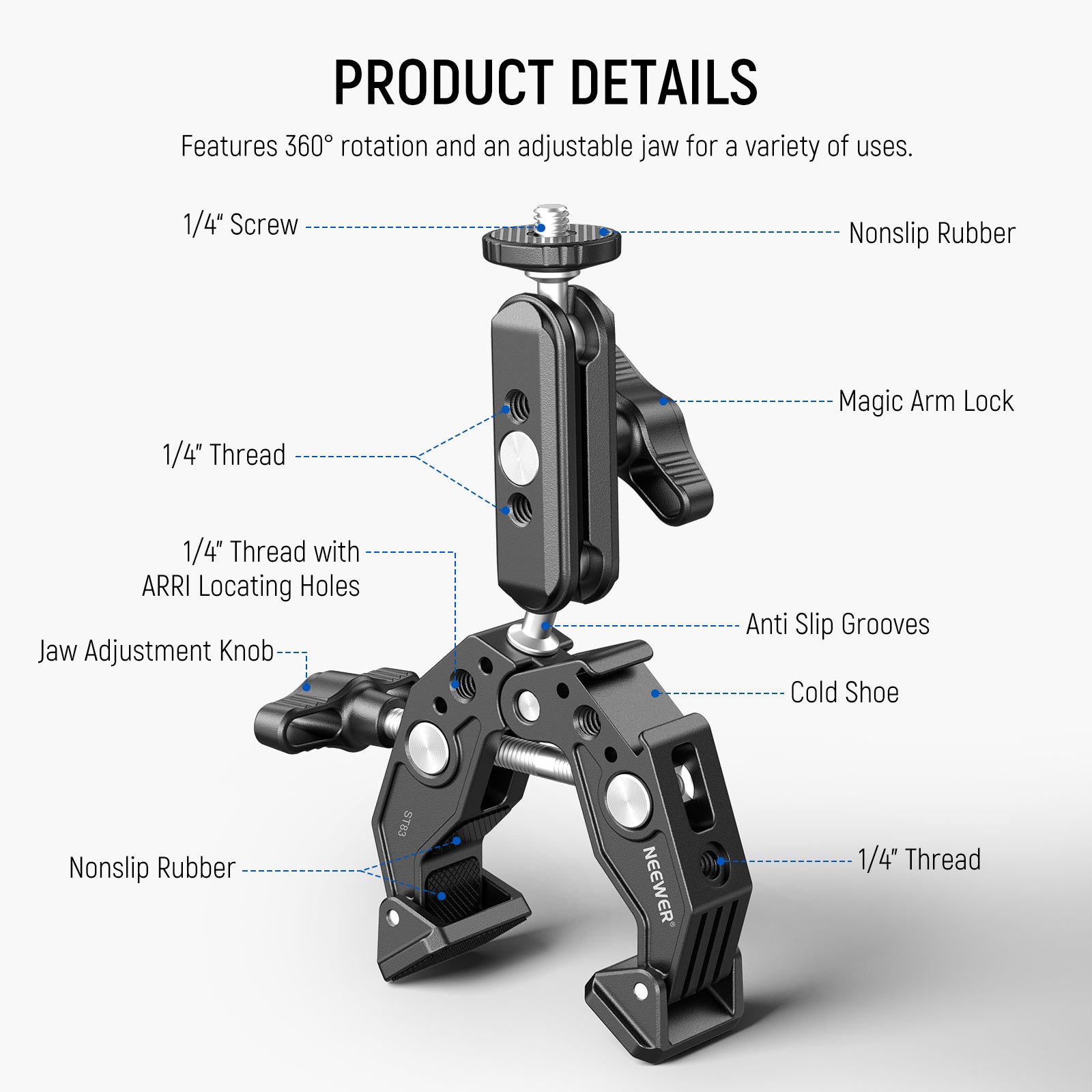 - Multiple Mounting Points- With 1/4" threads, ARRI locating points and a built-in cold shoe mount , the super clamp and magic arm can connect numerous accessories like a monitor, shoulder rig, and camera cage. A built-in cold shoe mount for quick mounting of LED fill lights, microphones, and more (not suitable for on-camera speedlite flashes)