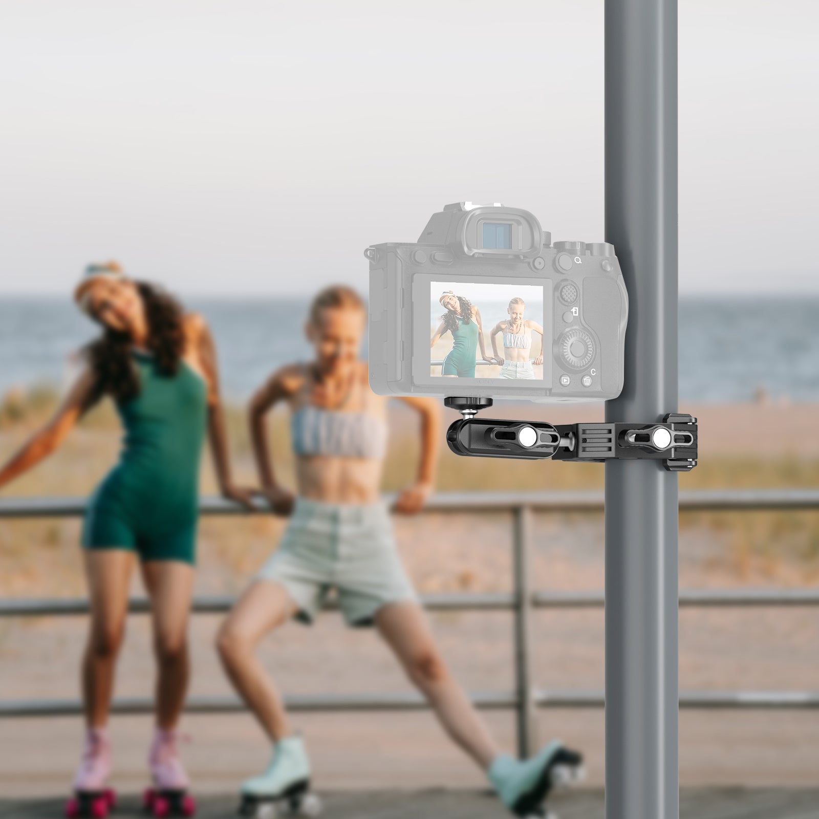 - Flexible Angle Adjustment- The two 360° rotatable ball heads on the 3"/7.62cm magic arm can be adjusted to any angle for optimal shooting flexibility. The screw knob of this motorcycle camera mount enables quick and easy fastening of the ball heads