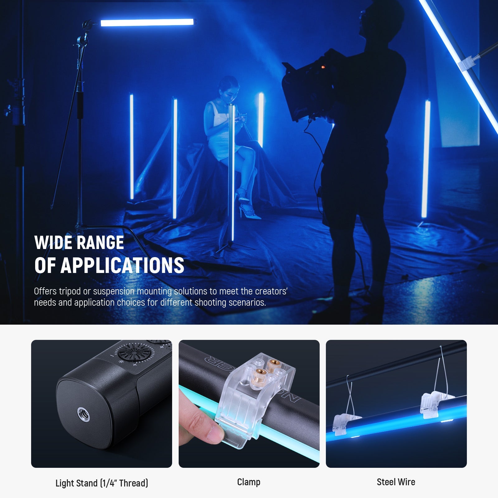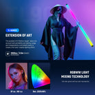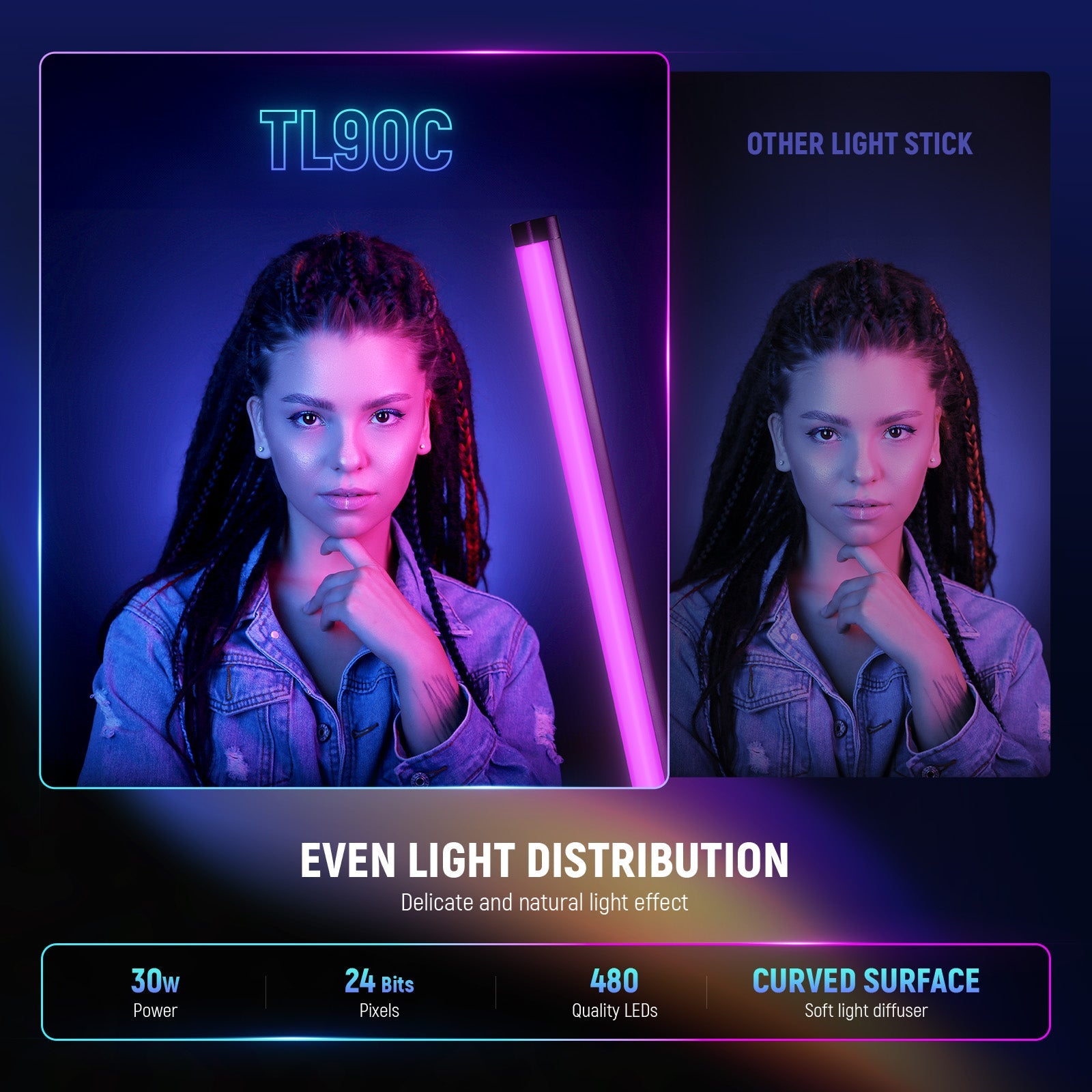 - 37" LED Tube Light with RGBWW Light Mixing- The TL90C, with a 37.2"/94.5cm extended length, brings up to 1650Lux illumination/0.5m, offering wide coverage without compromising portability. This 30W light stick provides soft, uniform lighting with high color fidelity (CRI 97/TLCI 98) and a broad color temperature range of 2500-10000K. Featuring RGBWW mixing technology, it delivers full RGB colors, covering over 90% of the Rec. 2020 color space for shaping diverse, creative ambiances