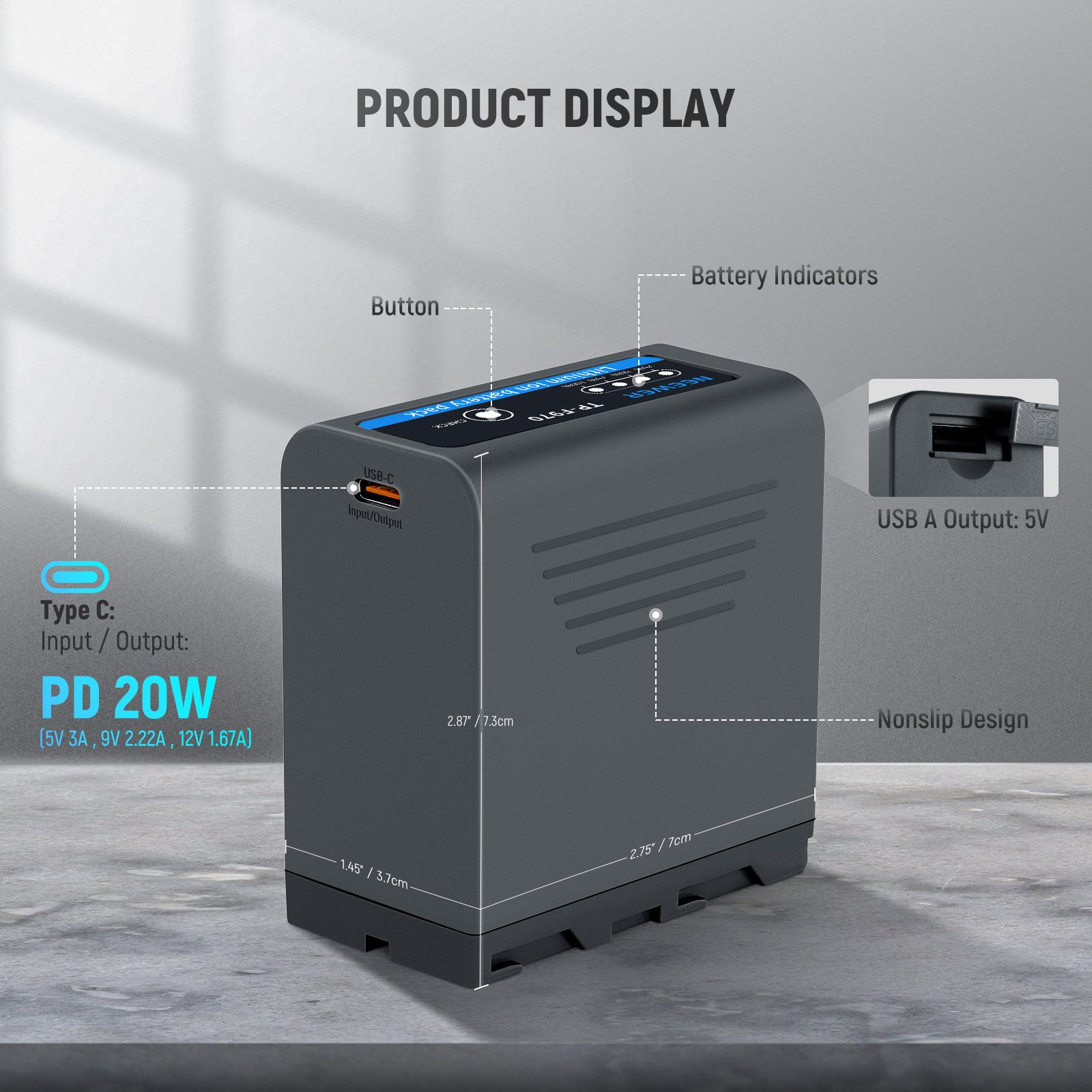 - Dual Ports & Easy Recharge- The NP-F970 battery is equipped with a USB A port and a bidirectional USB Type C port. The USB Type C port can function as an input or an output and support 20W PD fast charging to fully charge the battery in 3.5 hours. The USB A port features a 5V output to charge smartphones and tablets. Recharge the battery through wall sockets, car chargers, and portable chargers