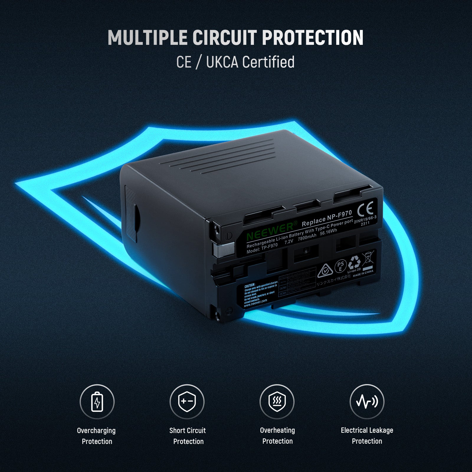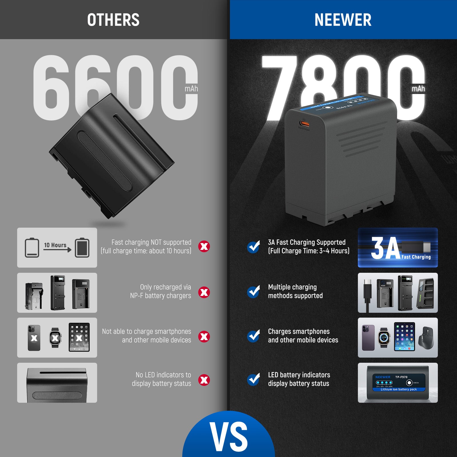 - Upgraded Higher Capacity Replacement Battery- NEEWER TP-970 rechargeable lithium battery features a high capacity (7.2V 7800mAh 56.16Wh) and offers a longer battery life than common NP-F batteries. Manufactured with premium cells, it can provide you with abundant and consistent battery power for capturing every wonderful moment in life