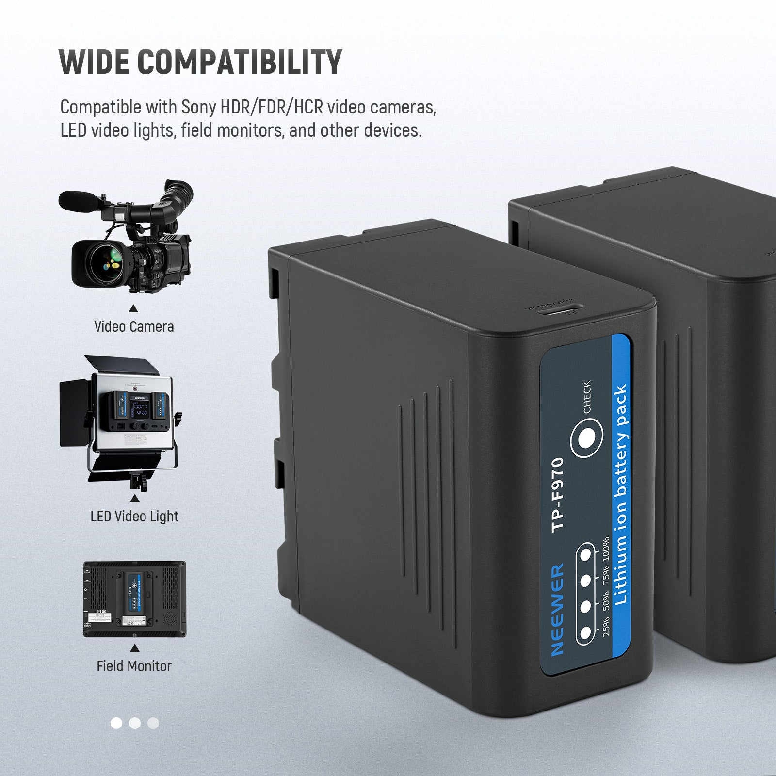 - Extensive Compatibility- A replacement for all NP-F series batteries, including NP-F550 NP-F570 NP-F750 NP-F770 NP-F960 NP-F970 NP-F975. Compatible with Sony cameras and camcorders such as CCD-RV CCD-SC CCD-TR CCD-TRT CCD-TRV CVX DSR DCR GV HDR HVL HVR MPK MVC PBD PLM series, NEEWER LED panel lights, ring lights, and field monitors