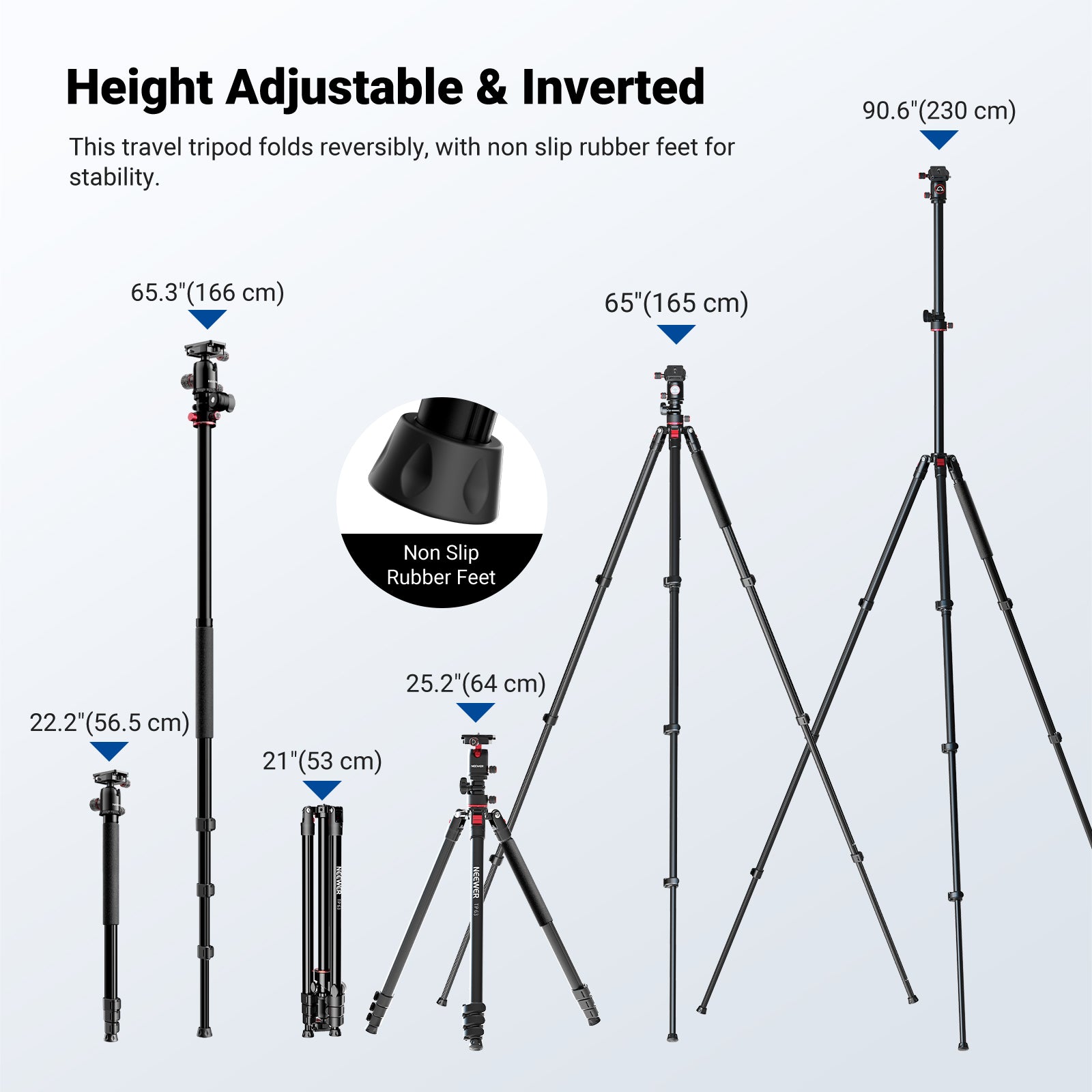 - Height Adjustable & Inverted Legs- Customize your shooting setup effortlessly with this travel tripod. It features three adjustable leg angles and a height range of 25.2 inches (64 cm) to 65 inches (165 cm), with a maximum height of 90.6 inches (230 cm) using the liftable center column. The tri pod legs fold in reverse for a compact size of 21 inches (53 cm), making it easy to attach to your backpack for outdoor photography. The non slip rubber feet provide stability on various surfaces