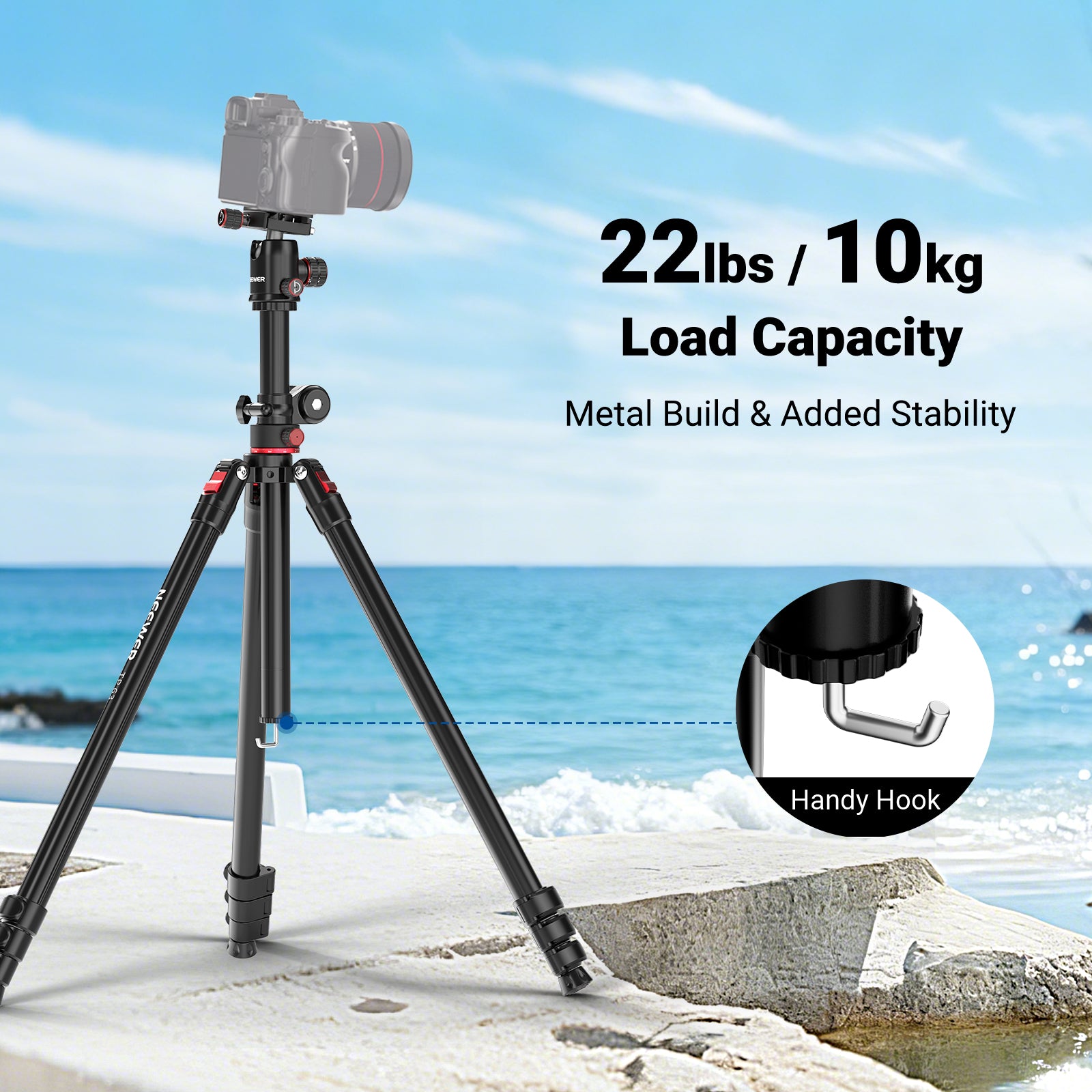 - Metal Build & Added Stability- Made of heavy duty metal alloy, the professional camera tripod supports equipment or photography gear like DSLR cameras, camcorders, telescopes, and sliders up to 22 lbs (10 kg). It includes a handy hook for hanging sandbags (not included), enhancing stability for steady shots in various conditions