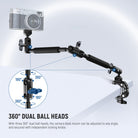 - Articulating Arm with Ball Heads- The two section friction boom arm offers a 55cm/22" extended length, and is equipped with three sets of 360° dual ball head adapters, enhancing the flexibility of angle and height, and secured with a simple twist of the locking knobs. Each ball head comes with multiple rubber rings to firmly grip your gear and prevent accidental drops