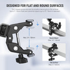 - For Both Flat Surfaces and Tube Rods- The V grooves and pivot tips of the desk camera mount securely grip flat surfaces (up to 2"/50mm thick) and cylindrical objects (up to 1.6"/40mm in diameter), such as desks, tripods, selfie sticks, light stands, shoulder rigs, bike/motorcycle handlebars, poles, etc. Also compatible with smallrig magic arms small rig camera accessories, compatible with DJI Ronin-M Ronin MX compatible with Freefly Movi 25mm and 30mm gimbal stabilizer rods