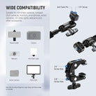 - Wide Compatibility- The 1/4" top screw is for mounting mirrorless cameras, compact DSLRs, field monitors, smartphones, action cameras, LED video lights, webcams, and other accessories. The 2.2"-3.2"/57-80mm adjustable phone holder is included, compatible with iPhone 16 Pro Max Plus 15 14 13 Mini 12 Samsung Galaxy S24/S23/S22 Ultra Pixel 9/8/7 Pro, etc. Several 1/4" and 3/8" threads and locating holes for ARRI are also for field monitors, LED video lights, microphones, etc.
