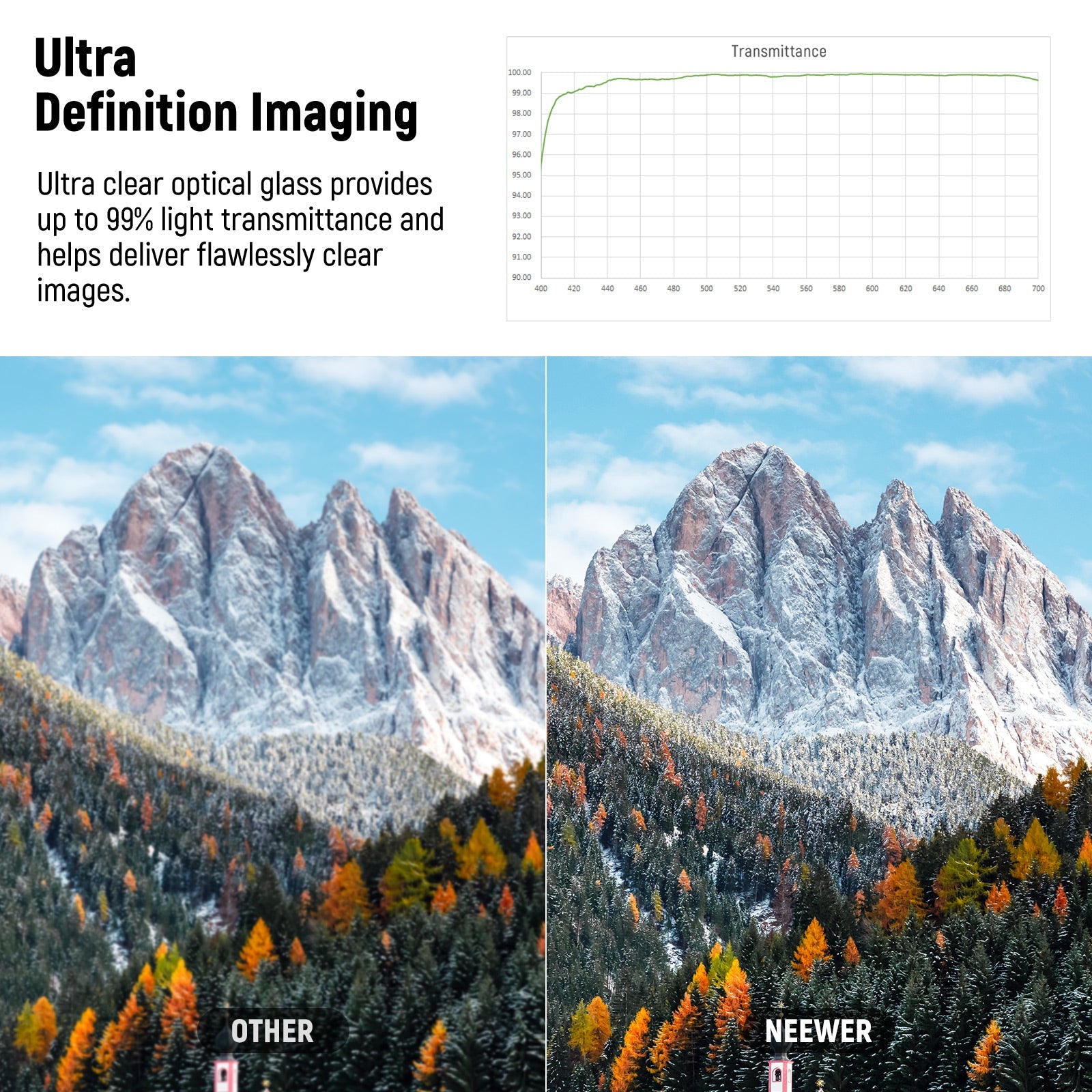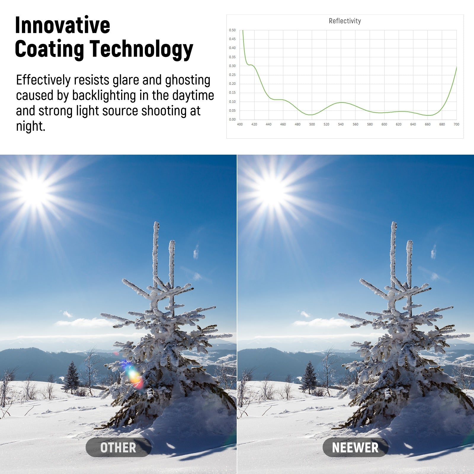 - Lens Protection and Lifelike Color- NEEWER Ultra Low Reflectivity UV Lens Filter protects your lens from dust, scratches, fingerprints, and bumps. Crafted with innovative coating technology, it effectively resists glare and ghosting caused by backlighting in the daytime and strong light source shooting at night, to capture images and footage with stunning clarity and true to life colors