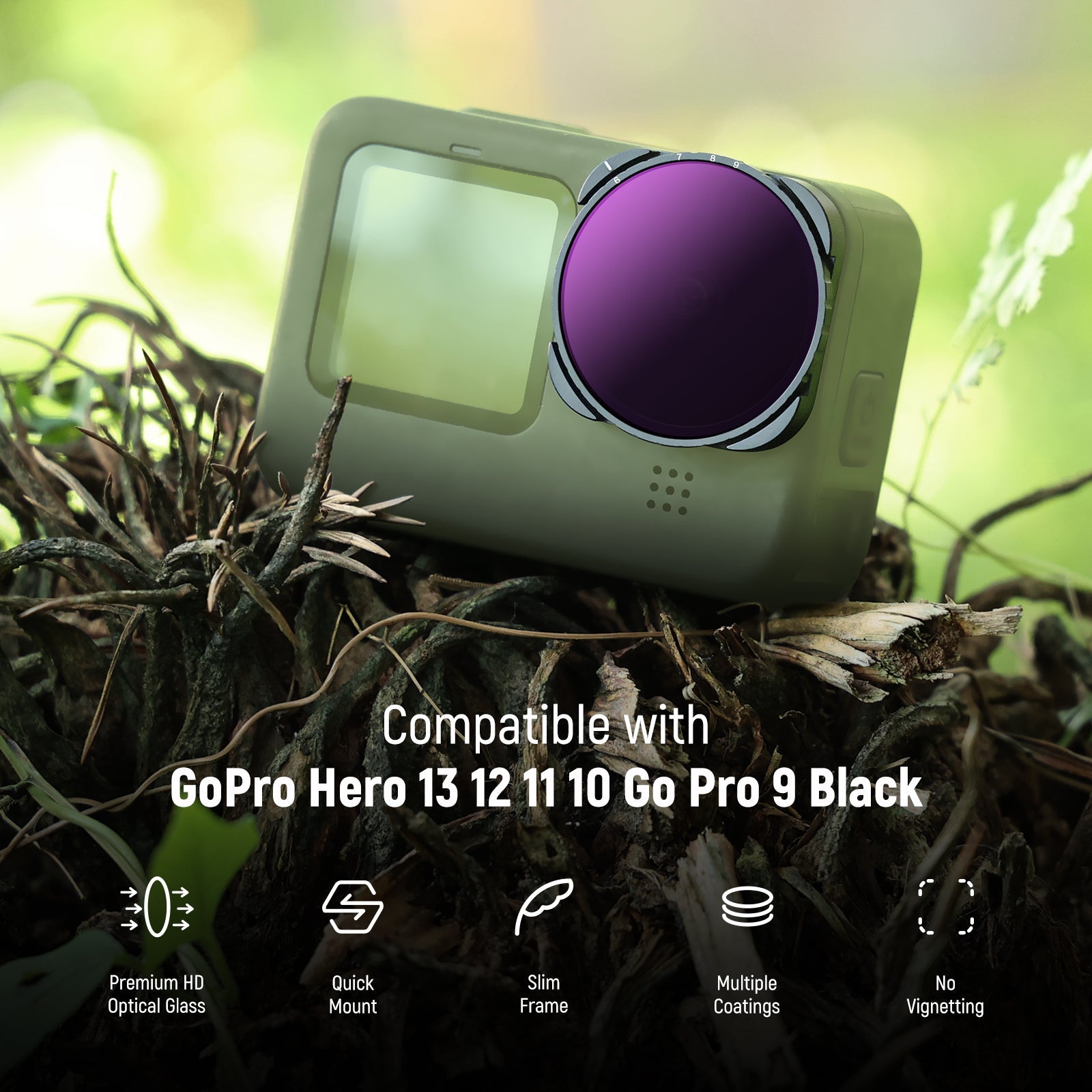 - Compatible with GoPro 9 10 11 12 13- This variable ND filter action camera photography accessories kit is compatible with GoPro 7 8 9 10 11 12 13 Hero 12 Creator Edition. It helps you easily handle various outdoor light conditions, from overcast to bright sunny days, and control the amount of light that enters your camera lens to avoid overexposure