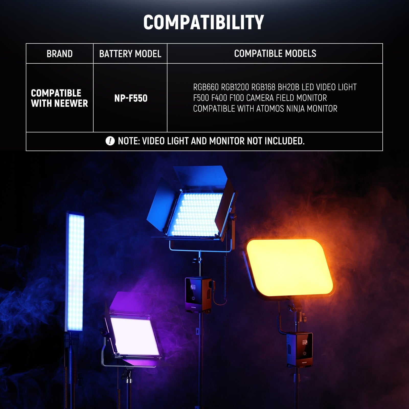 - Compatible Device Models- This dummy battery is a replacement battery for Sony NP-F550, and is fully compatible with NEEWER 660 RGB660 RGB1200 BH20B NL660 RGB168 NL228A NL480 SNL660 LED Light, F100 F400 F500 Monitor, and other devices that accept NP-F550 batteries. Compatible with Atomos Ninja Shinobi camera monitors, compatible with Godox LEDP260C, compatible with Aputure Amaran AL-H160 H198 H198C LED video light compatible with Hollyland transmission device