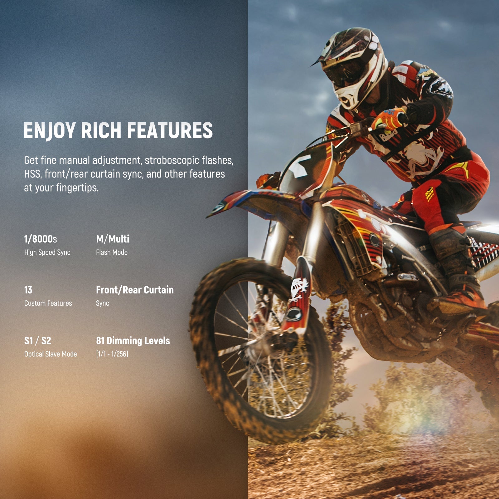 - Advanced Performance- Equipped with a powerful 76Ws output, it offers TTL auto flash, manual flash, stroboscopic flash, and optical slave modes (S1/S2). With high speed sync up to 1/8000s and first curtain/second curtain sync options, it provides precise control over your lighting. Enjoy additional features like flash exposure compensation (FEC), flash exposure bracketing (FEB), flash exposure lock (FEL), and more