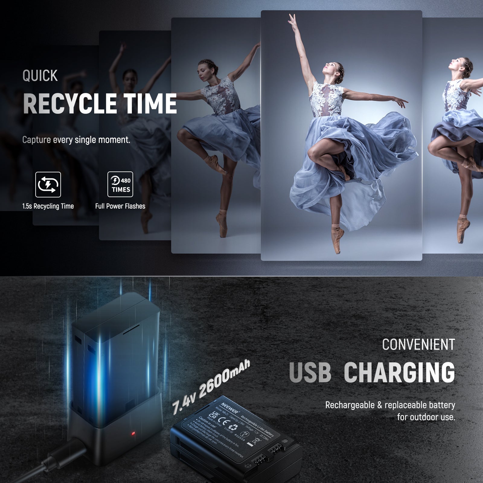 - High Capacity Battery & Flexible Bouncing- The 7.4V 2600mAh lithium battery (NB-Z1) provides 480 full power flashes, 1.5s fast recycling time, and a flash duration between 1/180s and 1/20000s, ensuring an enhanced shooting experience. The flash head allows horizontal adjustment from 0° to 330° and vertical adjustment from -7° to 120°, delivering unparalleled shooting versatility