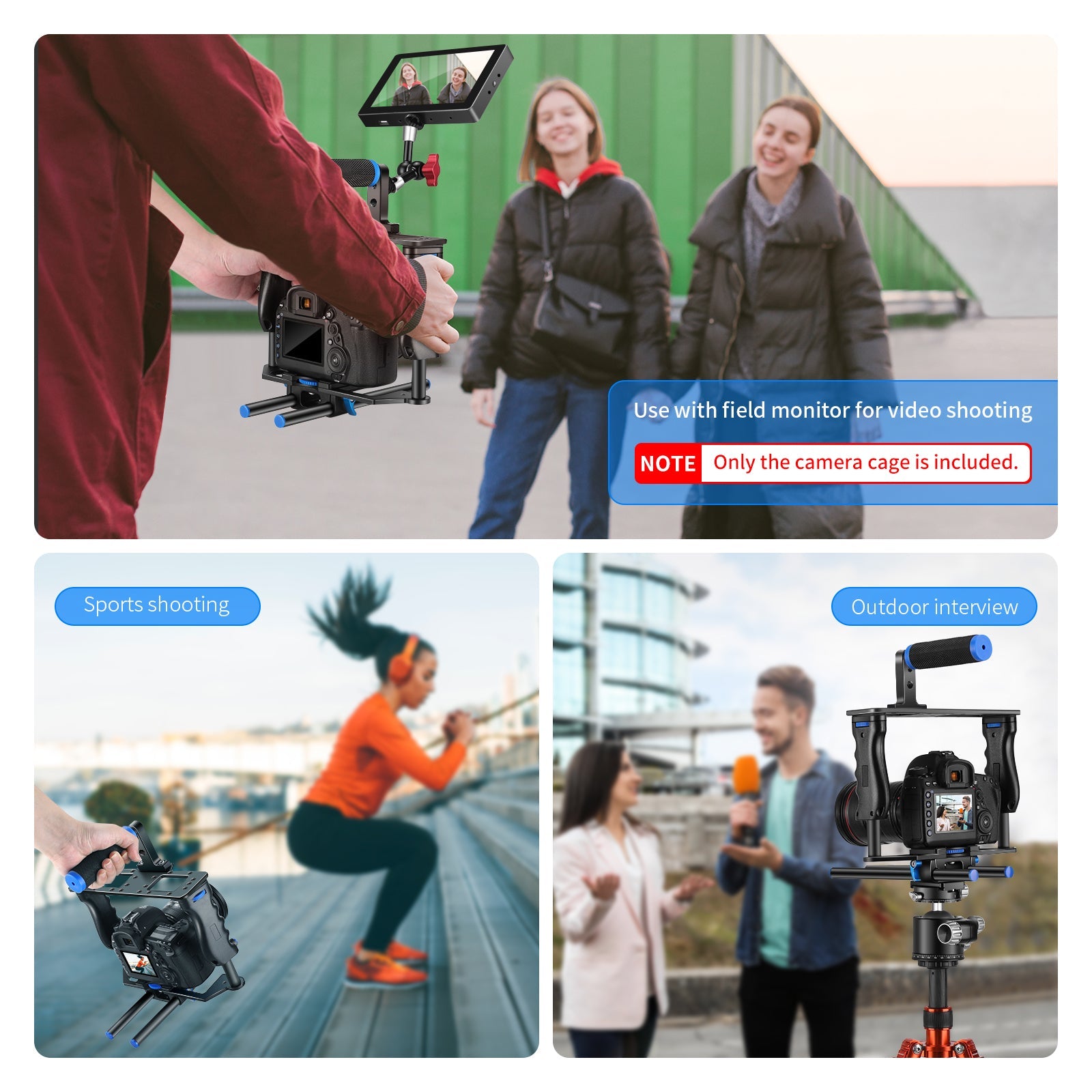 - Complete Accessories- The camera cage has ergonomic dual handgrips for stable shootings. The silicone top handle can attach to the camera cage for taking low-angle shots. And the integrated dual-rod base with two rods 15mm in diameter and a 60mm rod rail gauge can let you adjust the camera positions and mount accessories like a follow focus, a hood, and a lens support